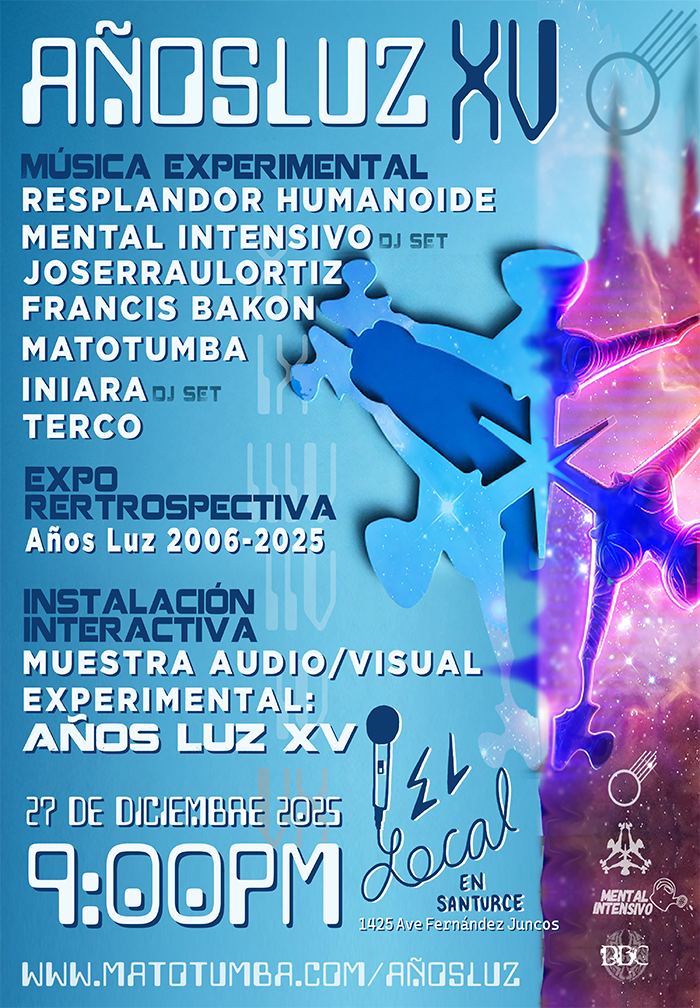 AÑOS LUZ es un evento de experimentación sonora, arte visual, teatro/performance materializado al borde de lo orgánico, lo primitivo y lo armonioso vs lo artificial, lo tecnológico y lo estridente; conceptualizado en una atmósfera Sci-Fi, la cual examina airosamente la siniestra sombra de un futuro distopiano y otros temas como la deshumanización masiva, gobiernos totalitarios, caos social, enfermedades rampantes, yermos post-apocalípticos, tecnología ciber-genética/bio-mecánica, viajes al espacio, viajes a través del tiempo y exploración intergaláctica.