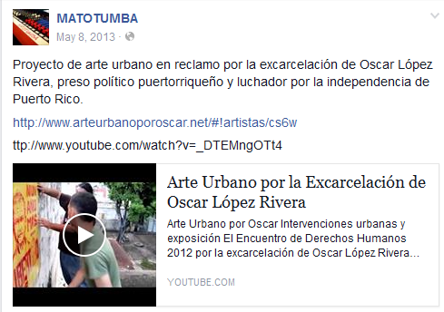 | 9 mayo - Arte urbano por Oscar, Sala Campeche, Museo de San Juan, Viejo San Juan. Robin y Vega exponen obras de arte para el proyecto de arte urbano en reclamo por la excarcelación de Oscar López Rivera, preso político puertorriqueño y luchador por la independencia de Puerto Rico. |