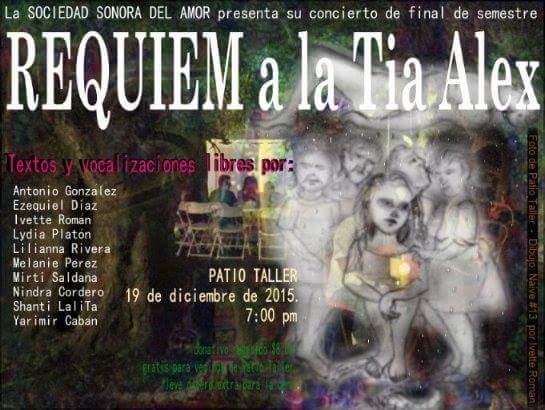 | 19 diciembre – La Sociedad Sonora del Amor presenta: Réquiem a la Tía Alex, Patio Taller, Carolina [Asistencia técnica, tramoya, iluminación y sonido] Textos y vocalizaciones libres por: Ivette Román Roberto, Antonio González Walker, Yarimir Cabán, Shanti Lalita, Ezequiel Díaz, Lydia Platón, Liliana Rivera, Melanie Pérez, Mirti Saldaña, Nindra Cordero |
