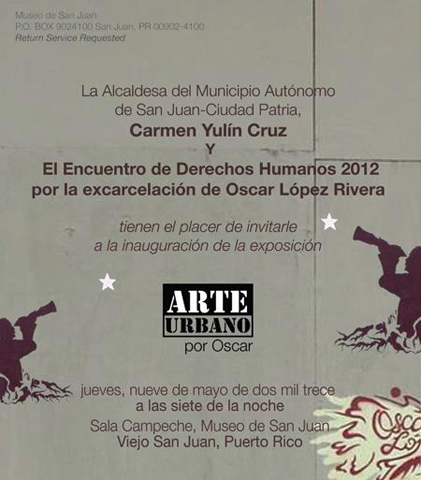 | 9 mayo - Arte urbano por Oscar, Sala Campeche, Museo de San Juan, Viejo San Juan. Robin y Vega exponen obras de arte para el proyecto de arte urbano en reclamo por la excarcelación de Oscar López Rivera, preso político puertorriqueño y luchador por la independencia de Puerto Rico. |